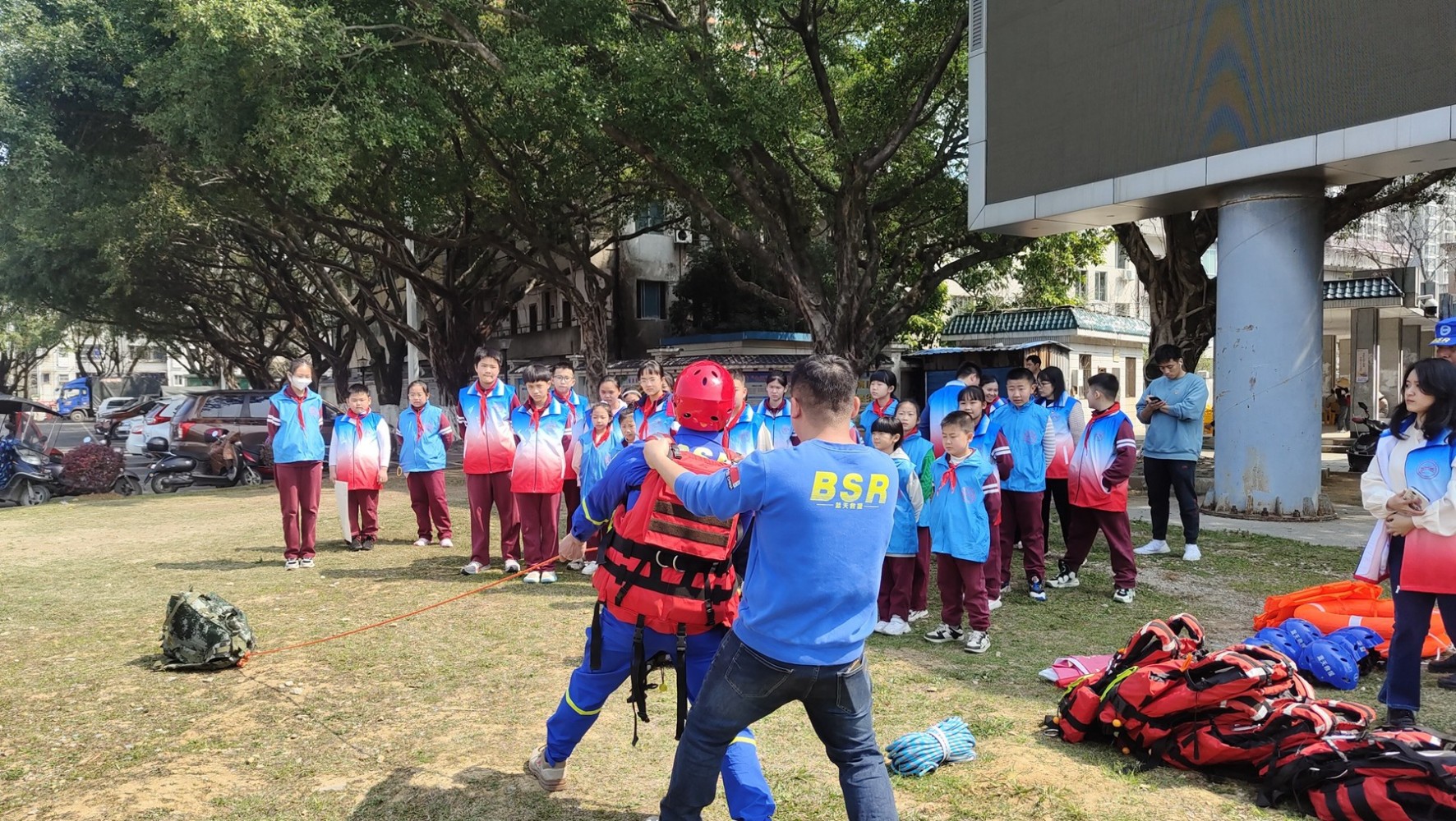 队员们为学生普及防溺水知识并且现场演示如何自救。