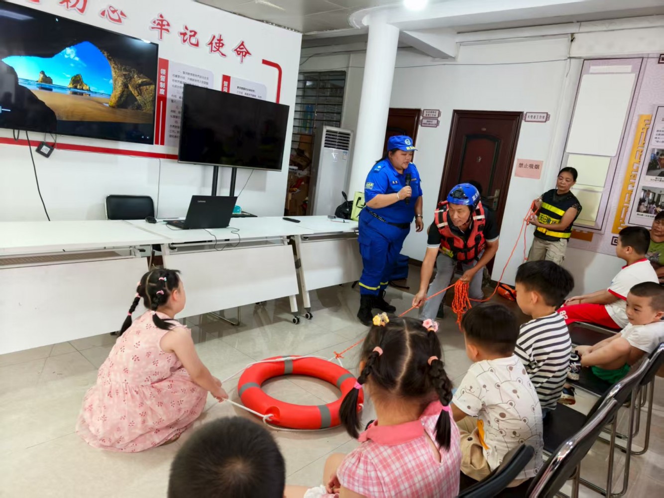 活动伊始,现场播放了蓝天救援队宣传片,生动展现了救援队员的专业风采与责任使命,迅速吸引了社区小朋友的注意力,为本次宣讲活动拉开精彩序幕。宣讲环节中,救援队员用通俗易懂的语言,围绕“溺水危害”“日常预防要点”等核心内容展开细致讲解,帮助小朋友们建立清晰的防溺水安全认知,夯实安全防护基础。