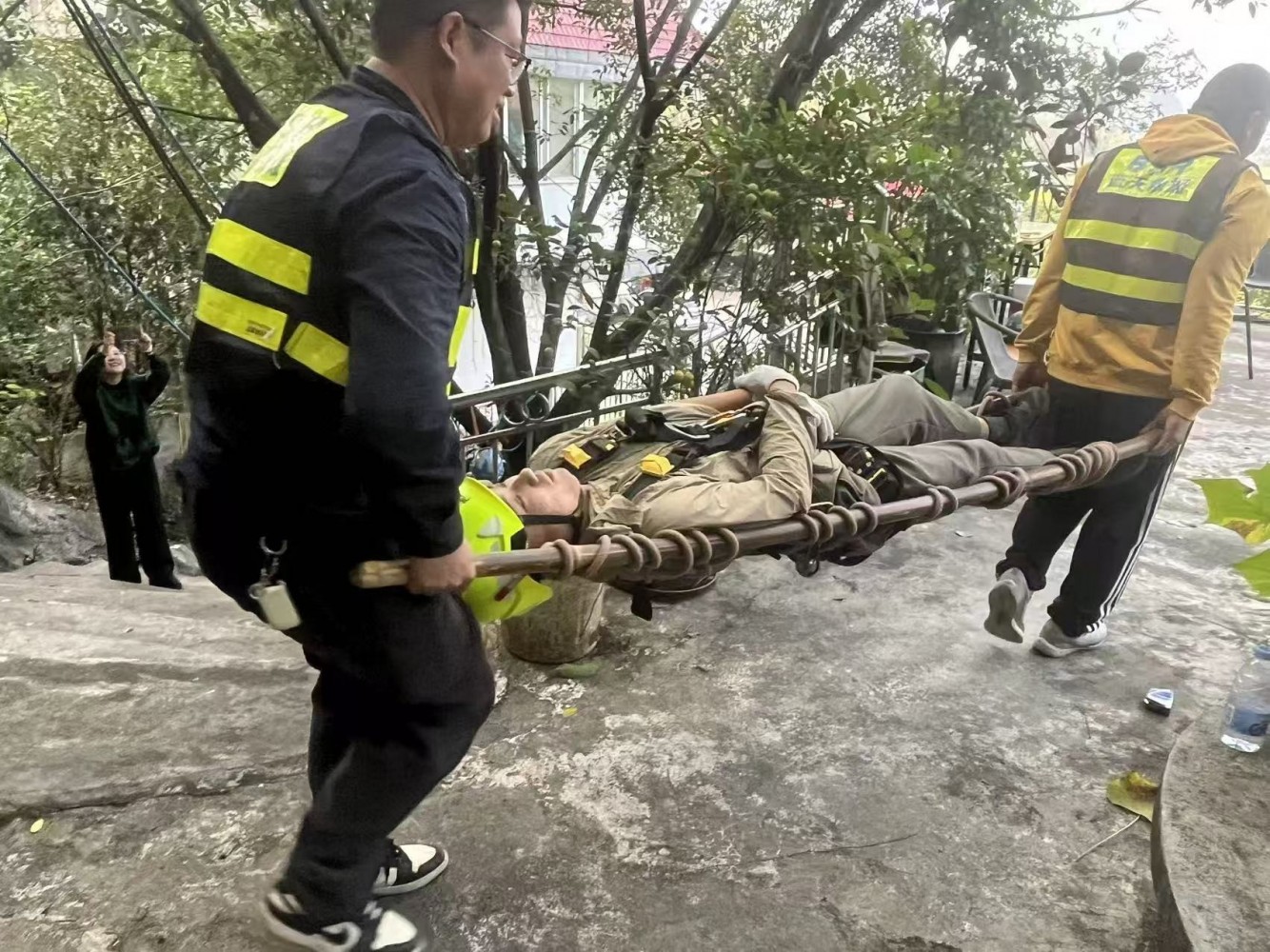 理论与技能教学结束后,训练转入实战模拟环节。队员们模拟接到山地救援电话,针对“有人被困山上”的突发情况开展实地救援演练:队员在悬崖区域模拟被困人员,其他队员迅速定位被困者位置并实施救援,成功将被困人员解救后,又将模拟受伤人员转移至安全地带进行专业包扎处理,整个演练流程紧凑有序,各环节衔接流畅。