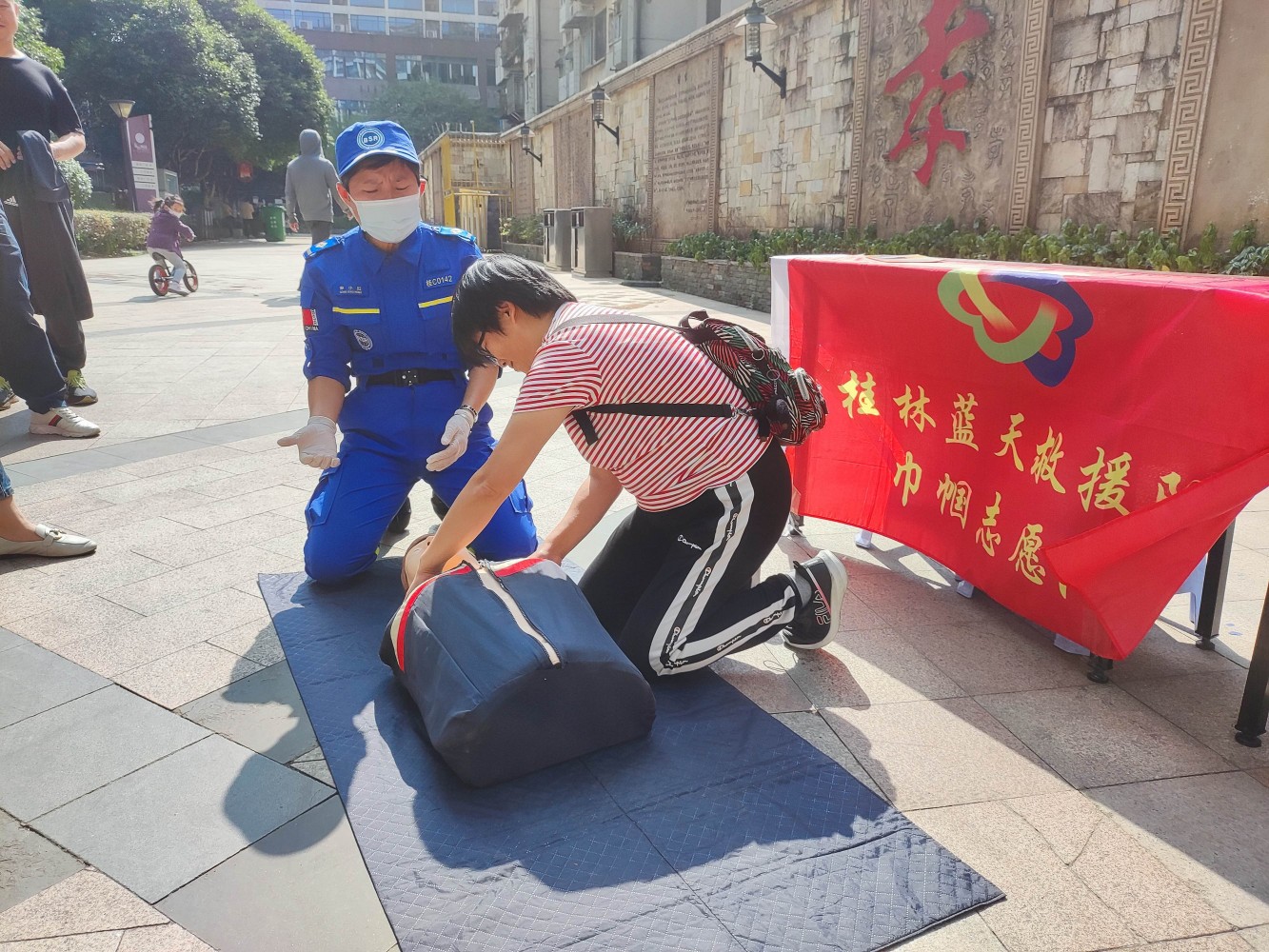 我们的队员按照分的小组到达桂林桂大社区,叠彩社区后积极地开展志愿活动根据自己在救援队所学,为社区居民展示心肺复苏急救,给居民示范正确的急救方式。并让居民亲自体验心肺复苏急救,耐心地鼓励指导居民亲自体验,并在过程中纠正错误。