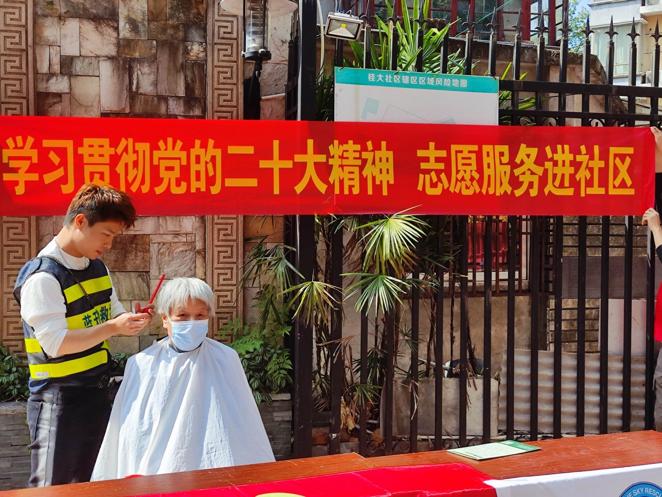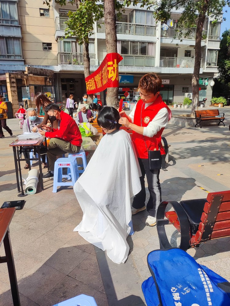 本着帮助居民,为居民提供生活便利的理念,我们的队员还办起了理发站,免费地帮助社区居民理发。